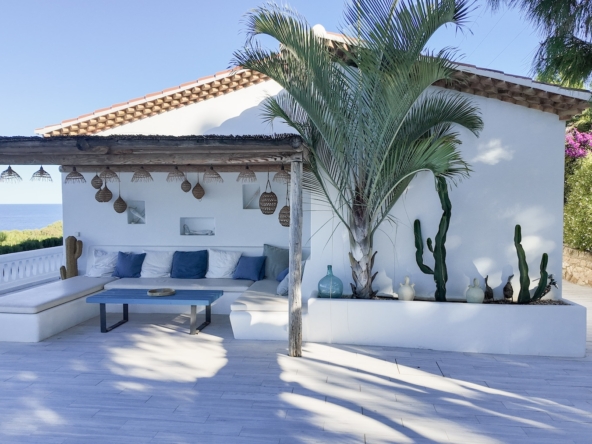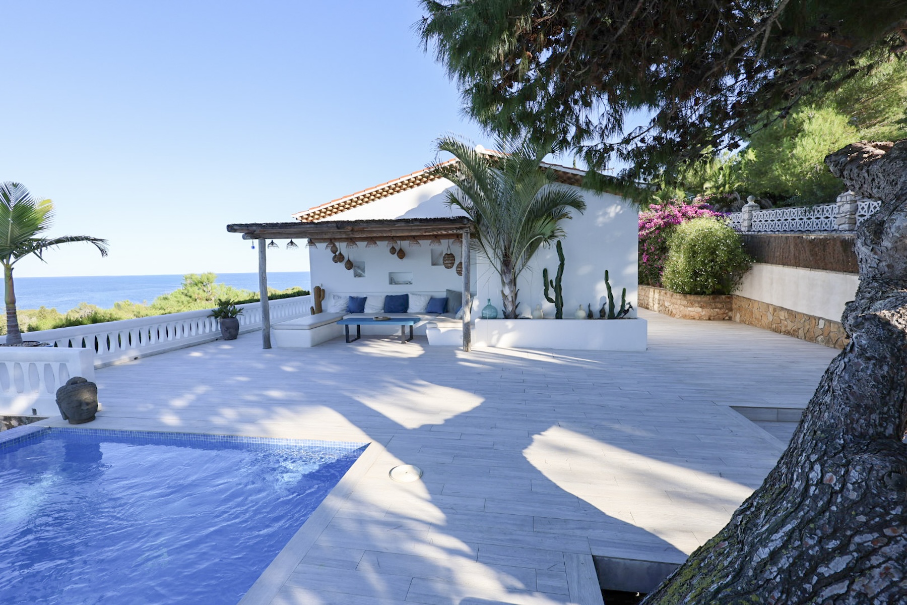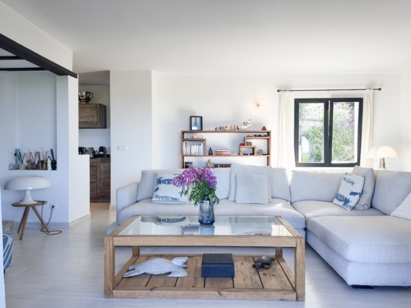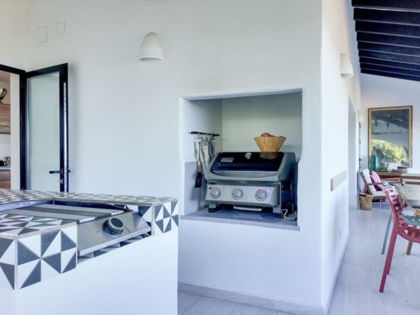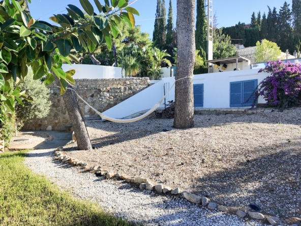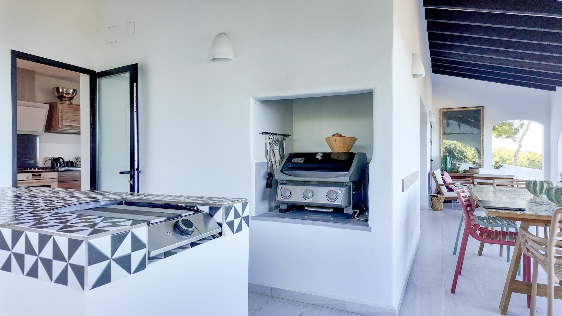 En el exterior, la amplia naya cubierta, equipada con cocina de verano y un salón integrado, prolonga la vida interior hacia la piscina privada de intenso color azul, las terrazas y las zonas chill‑out del jardín mediterráneo.