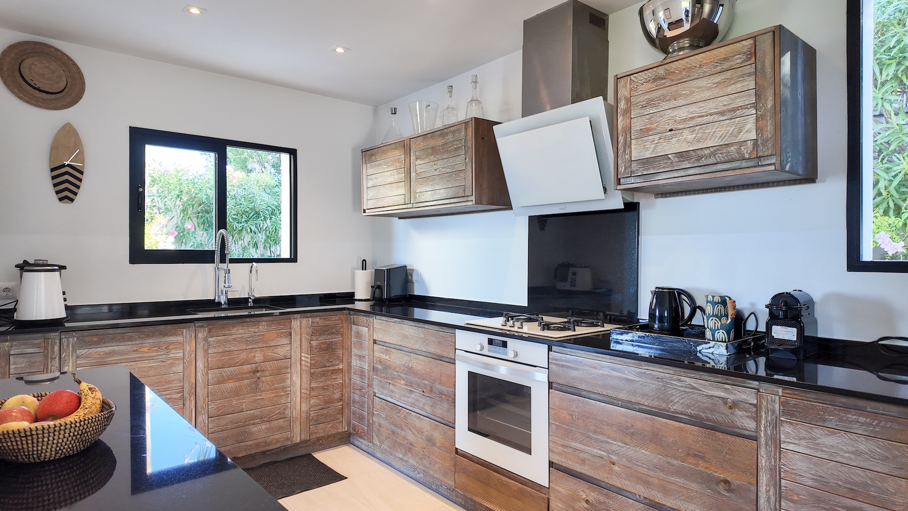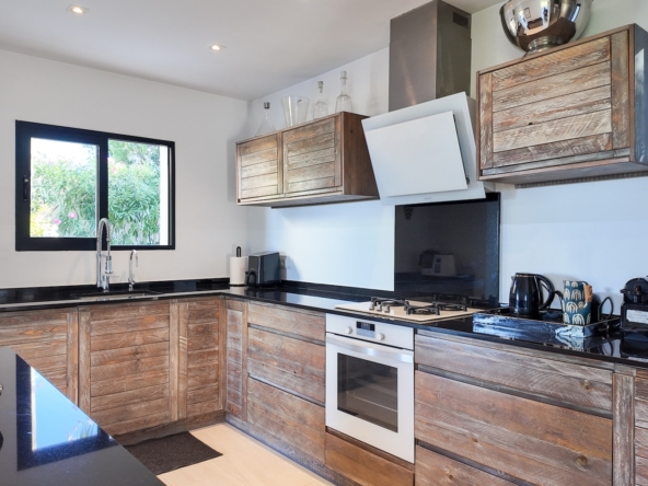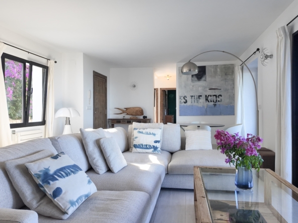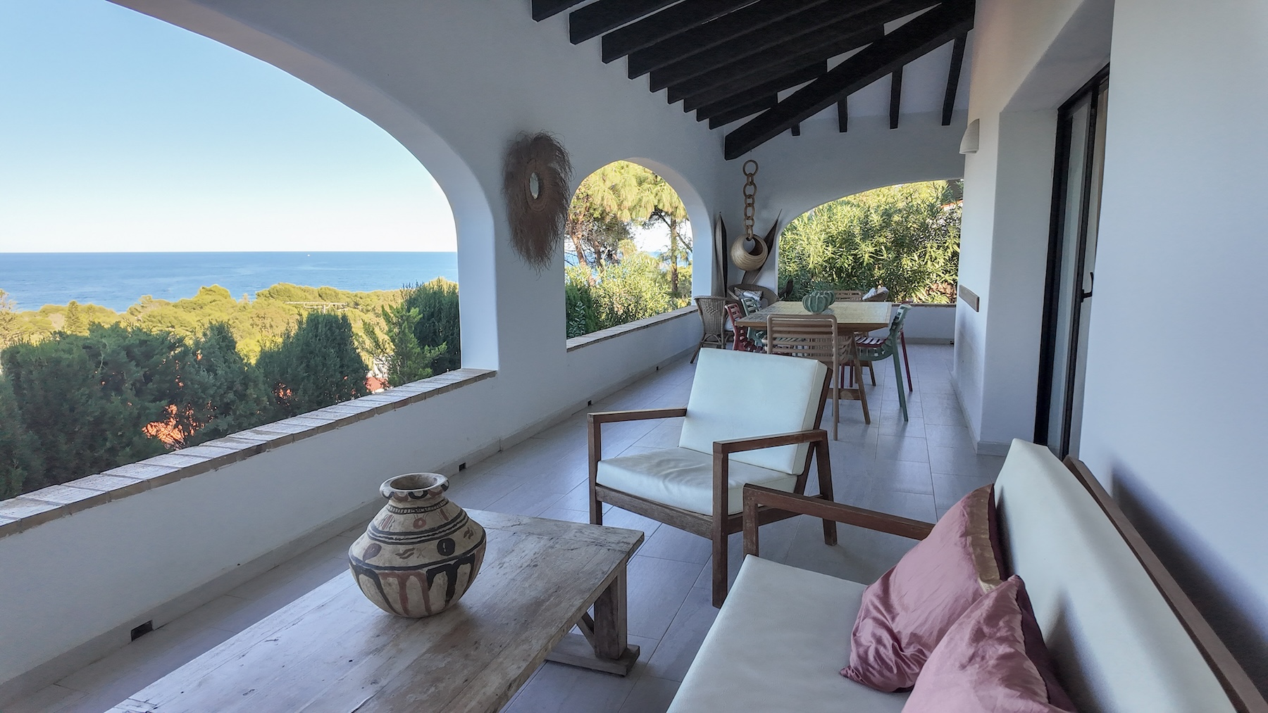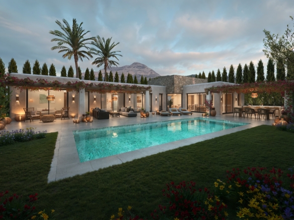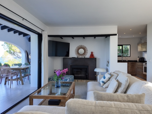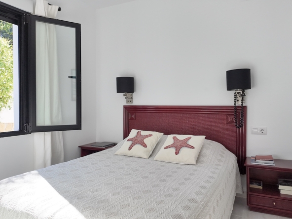 En el exterior, la amplia naya cubierta, equipada con cocina de verano y un salón integrado, prolonga la vida interior hacia la piscina privada de intenso color azul, las terrazas y las zonas chill‑out del jardín mediterráneo.
