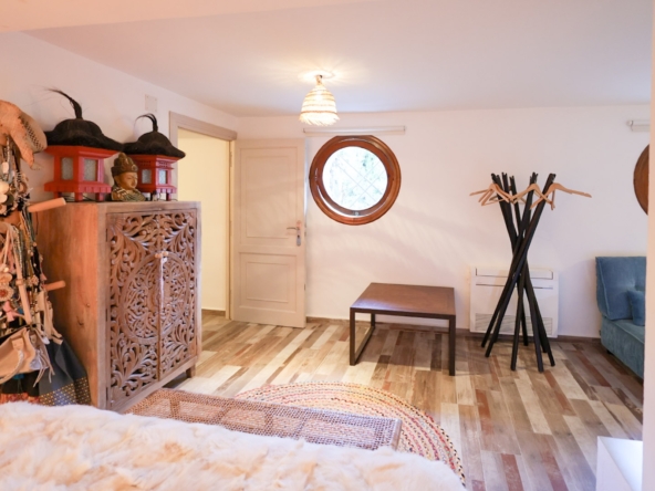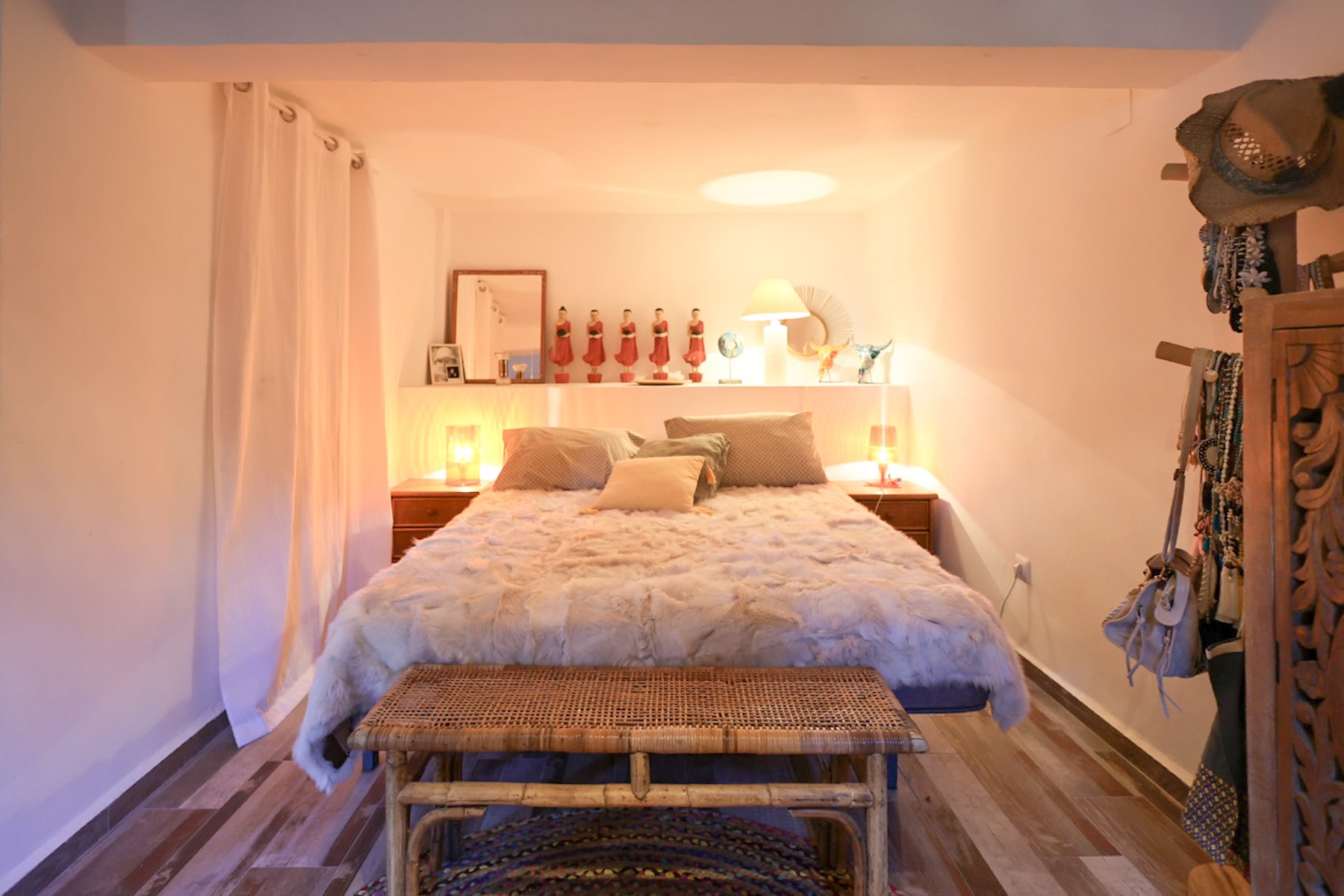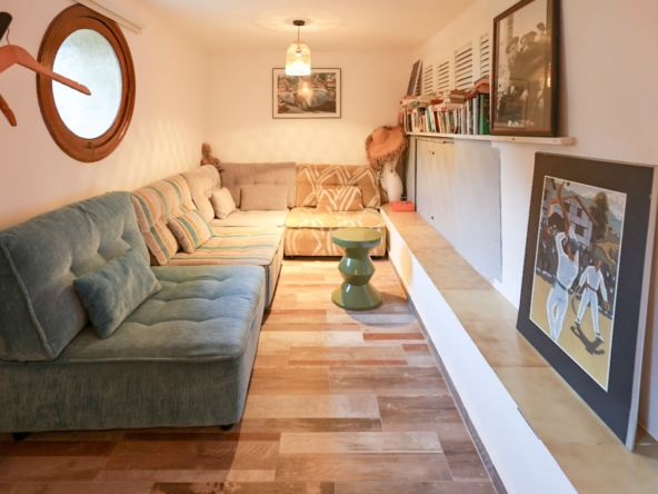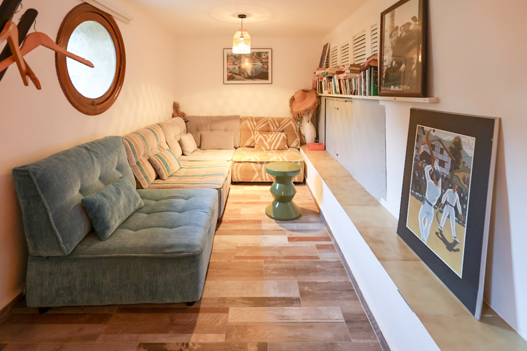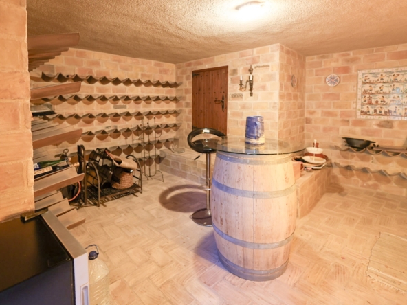 El nivel inferior comprende una gran habitación con su pequeño salón (espacio polivalente con posibilidad de habilitar un apartamento independiente)., un baño, lavadero, vestidor, un taller y una bonita bodega de estilo rústico — perfecta para recibir.