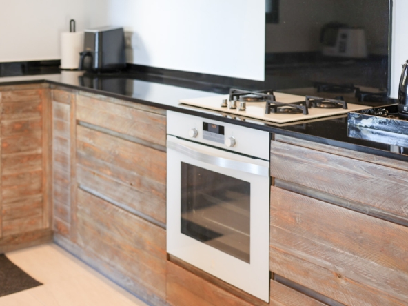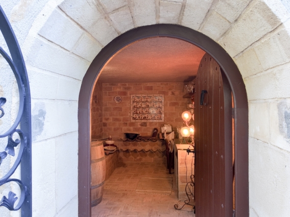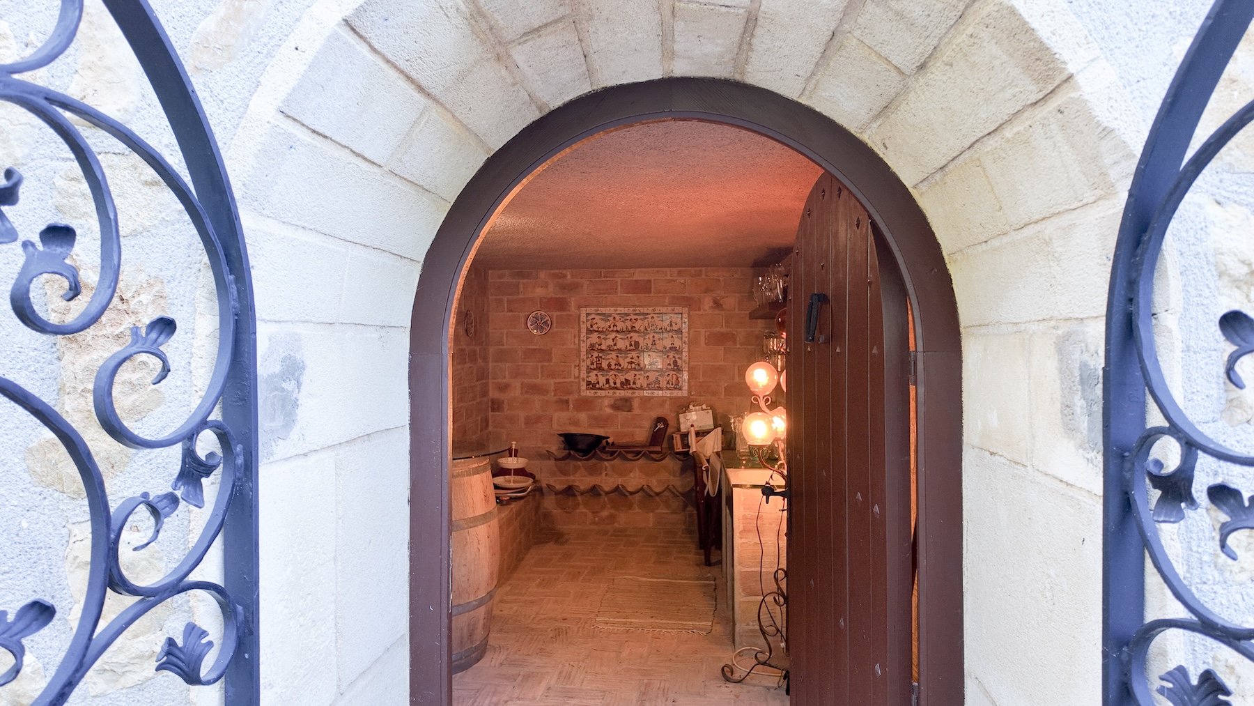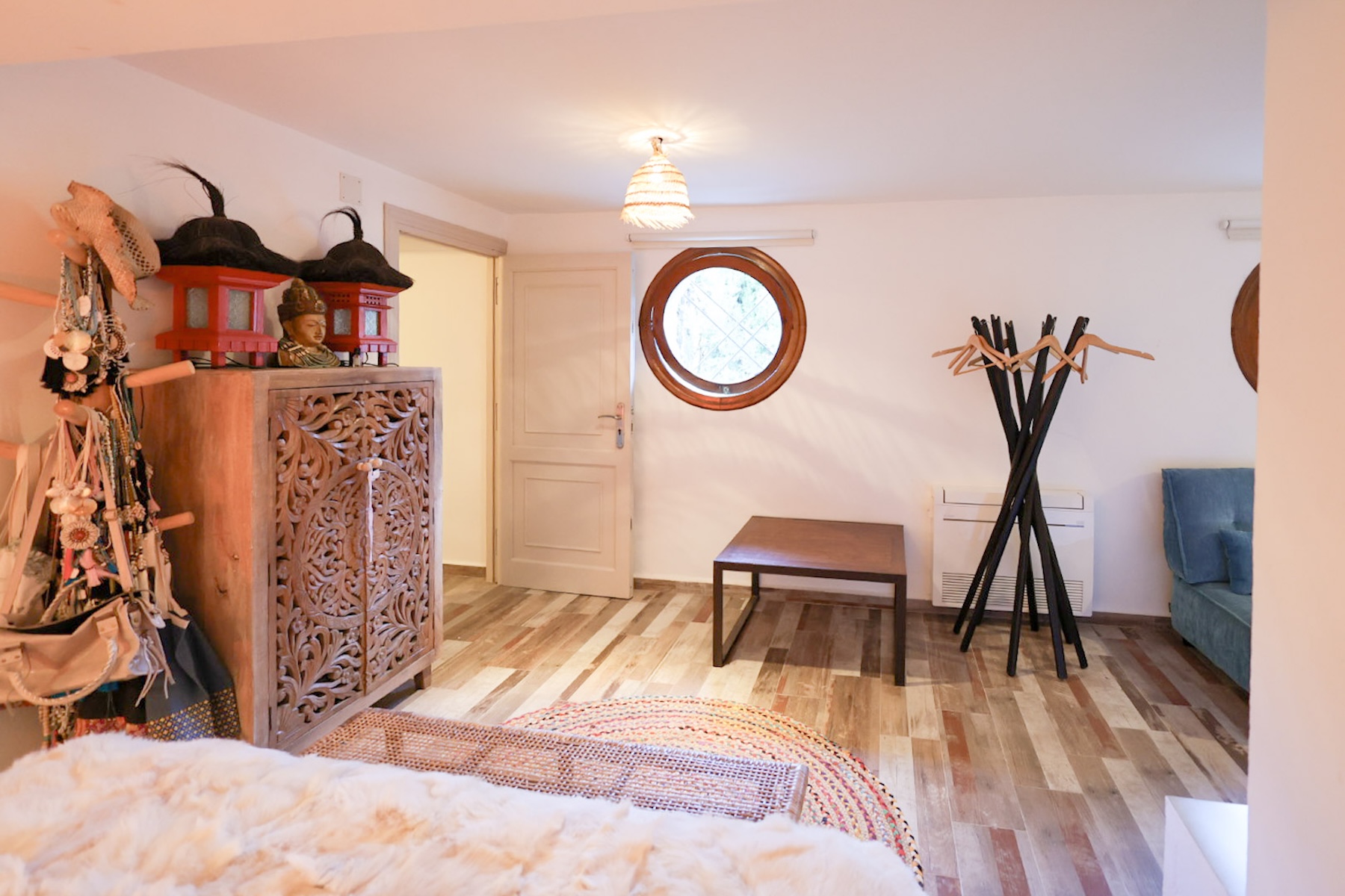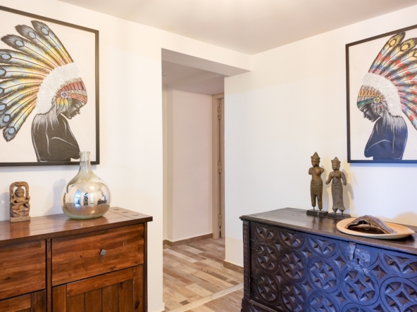 El nivel inferior comprende una gran habitación con su pequeño salón (espacio polivalente con posibilidad de habilitar un apartamento independiente)., un baño, lavadero, vestidor, un taller y una bonita bodega de estilo rústico — perfecta para recibir.