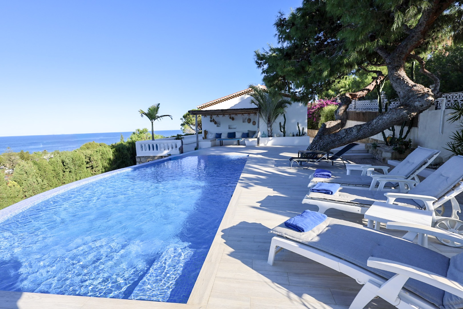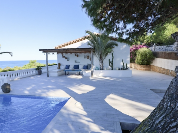 Casa Caballo del Mar, magnífica villa de 310 m² situada en una parcela privada y soleada de 1.524 m² en Las Rotas, Dénia. Totalmente reformada en 2020, la propiedad combina acabados contemporáneos y materiales naturales. La planta baja se abre a un amplio salón‑comedor luminoso con grandes ventanales que dan a una terraza cubierta con vistas al exterior y al mar. La cocina interior es independiente, moderna y totalmente equipada. En este nivel hay también una habitación doble con baño separado y la gran suite principal con vistas al mar, vestidor y baño en suite.
