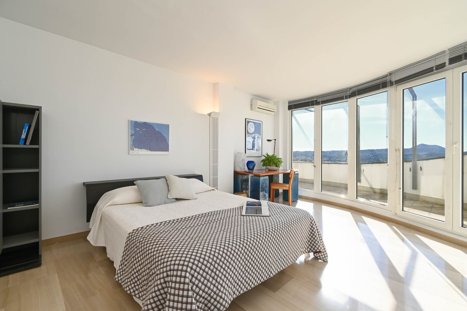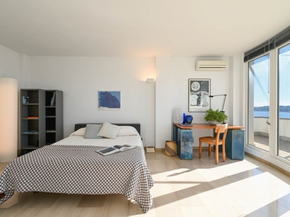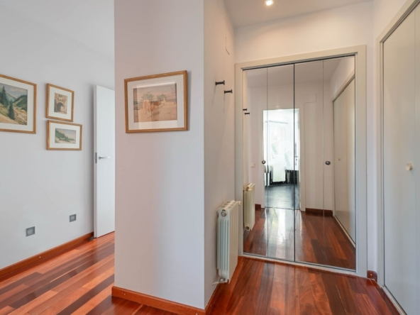 En este mismo nivel tenemos acceso a la cocina, una habitación individual y un baño completo. En el lado opuesto del salón encontramos la zona del dormitorio principal; una estancia con chimenea y salida a balcón propio, baño en suite y un vestidor integrado en la misma zona privada.