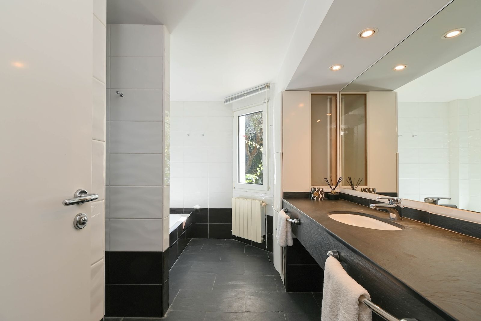En la planta superior se encuentra una gran habitación con su baño en suite iluminado por claraboya y una terraza solarium totalmente privada .