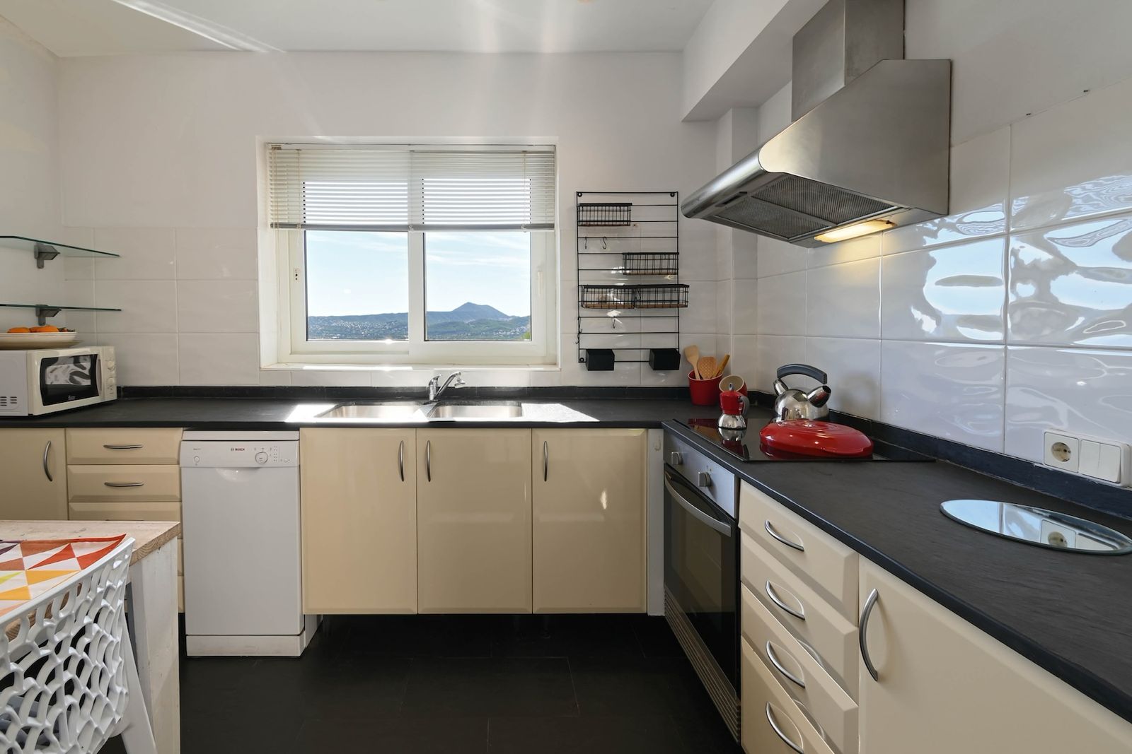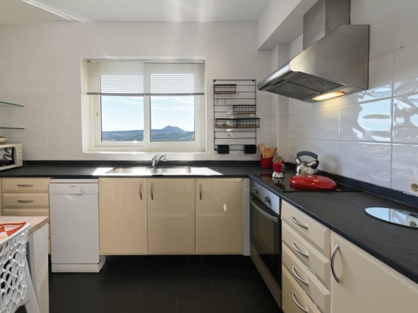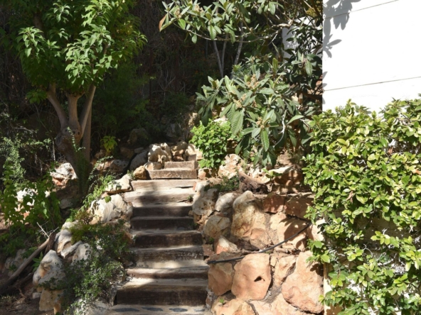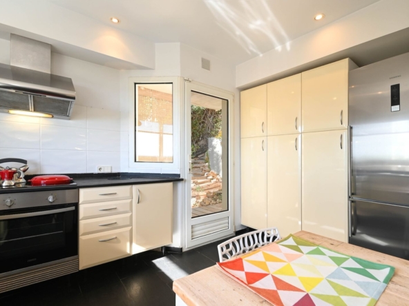 La cocina, con preciosas vistas está totalmente equipada y a través ella se accede al jardín y la planta inferior mediante unas escaleras estilo mediterráneo.