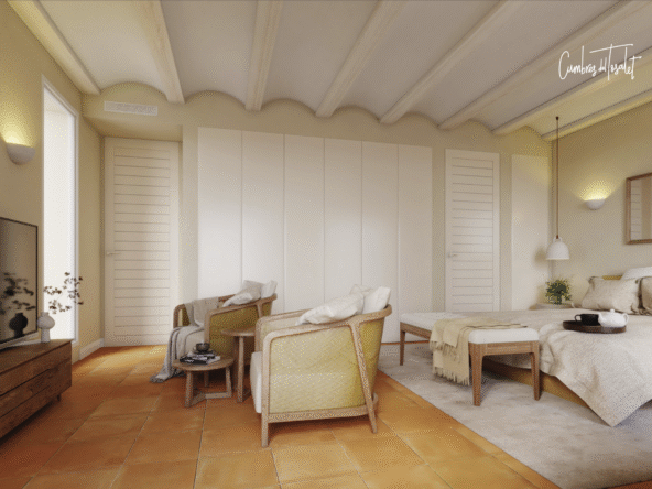 La superficie construida de cada vivienda es de 180m2 con orientación Sur. La luz del Mediterráneo penetra con fuerza en todas las estancias incluidas las tres habitaciones que componen cada unidad residencial (hay una opción para 4 habitaciones). Cocina superequipada, salón y comedor integrados, acondicionamiento climático por aerotermia de última generación son evidencias de un nivel de calidad alto.